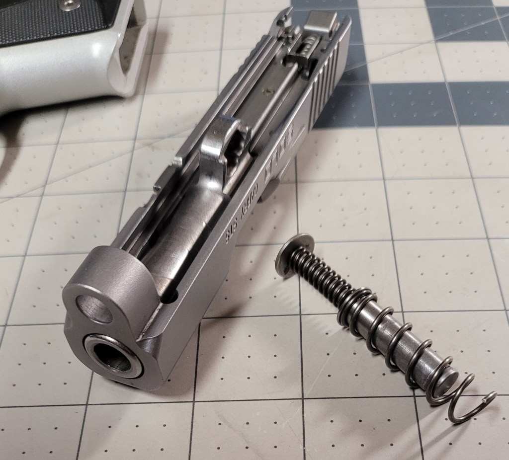 The recoil spring guide rod actually seats into a pocket on the frame – if it is positioned correctly on the barrel lug when you put the slide back on – if the guide rod doesn’t position correctly it will hang up on the “lip” of the pocket and will be crooked enough at the far end that it will bind on the slide and try to stop the slide from cycling to the rear more than about 5/8 of an inch . . .