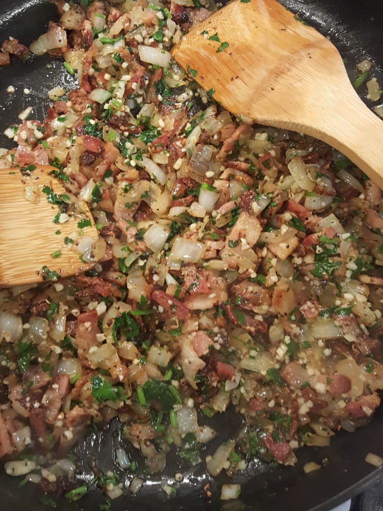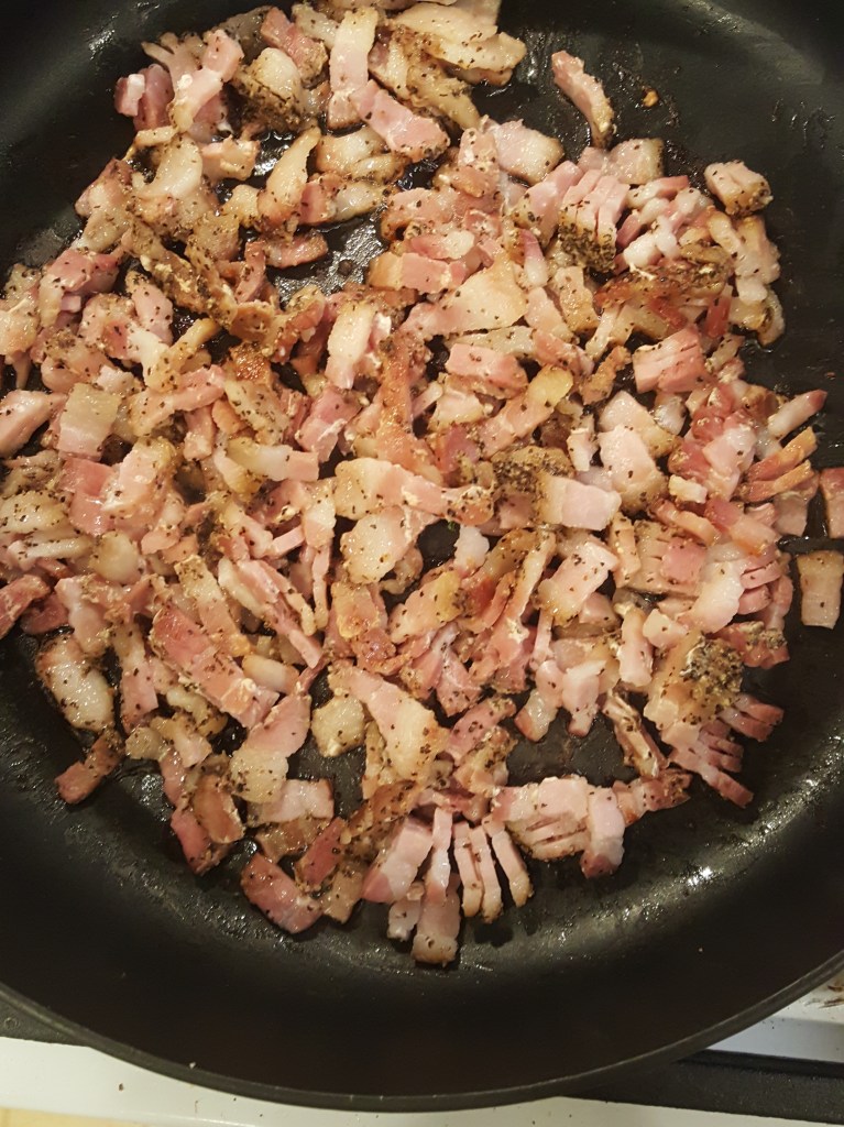 Dice 1/2 pound of bacon – either pepper bacon or throw 2 teaspoons of coarse ground black pepper in when you brown it