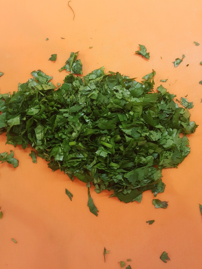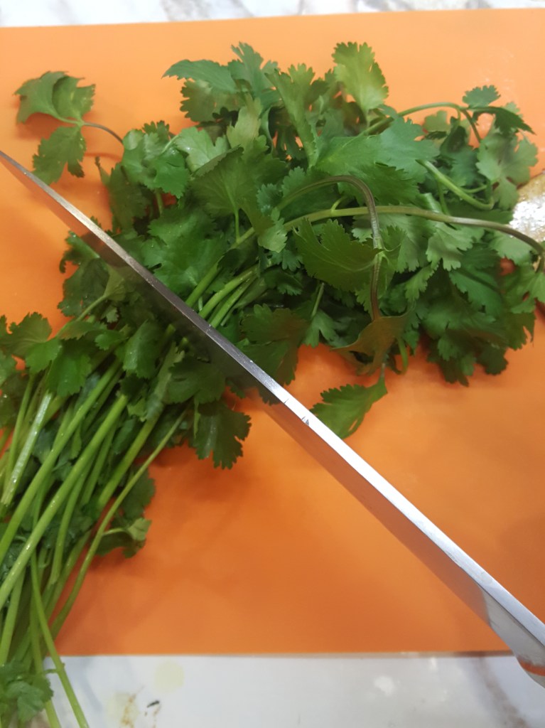 Meanwhile chop up about 1/2 bunch of cilantro – and chop it up real fine – after you are done chopping it – run the knife through it two more times – it needs to be chopped fine – you want to end up somewhere between 1/4 and 1/2 cup chopped