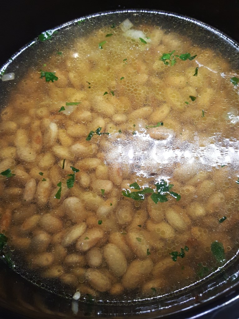 You may need to add a little chicken broth at the 5 hr mark – you don’t want the beans to dry out – you want them doing the floaty thing start to finish !! This particular batch I added just over 1/2 cup of broth at 5 hrs . . . and speaking of finish . . .