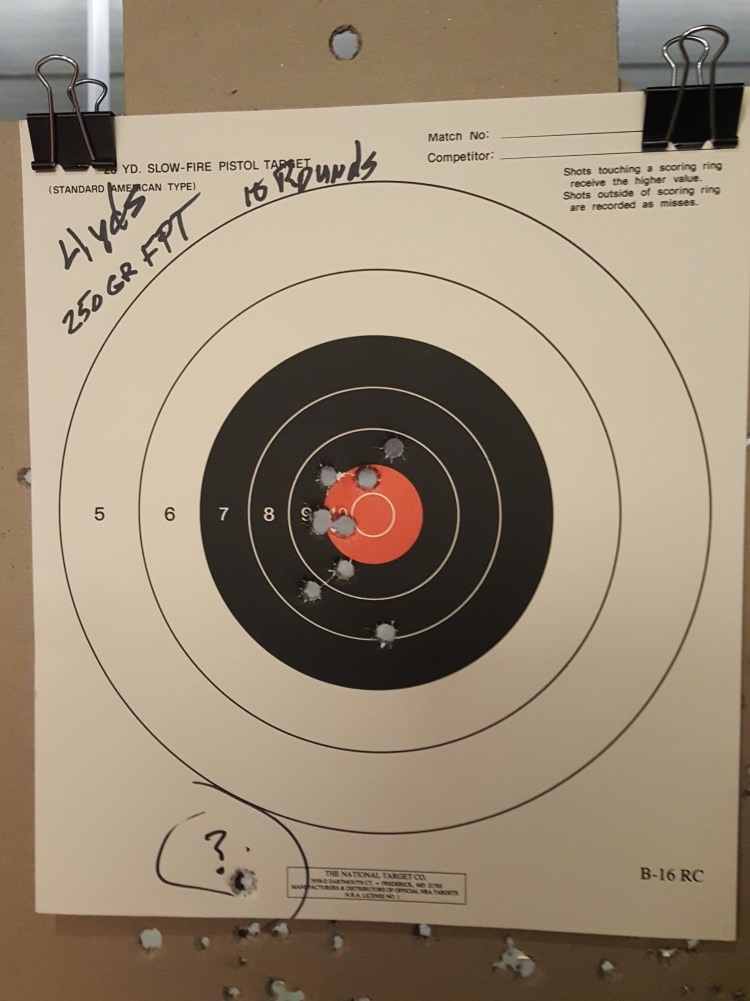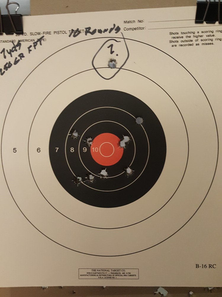 Am not sure what that flyer down low is about – but there’s 10 carefully aimed shots – right by the number 9 on the target dropped three rounds almost in the same hole – then went to 7 yards . . .
