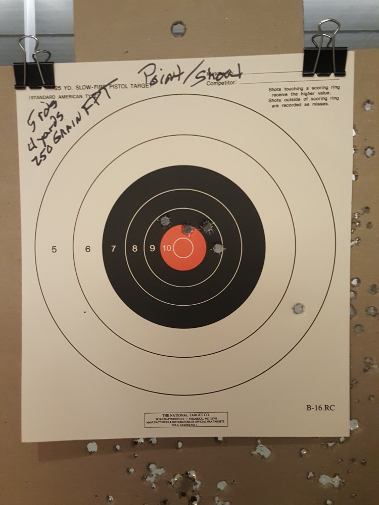 And a flyer up top – the hole way up top on the cardboard backer is not mine – the birds head grip really helps manage recoil – went back to 4 yards again and cranked off 5 rounds just as fast as I could pull the hammer back and drop it – just a point and shoot kinda thing . . .