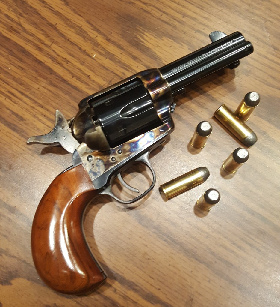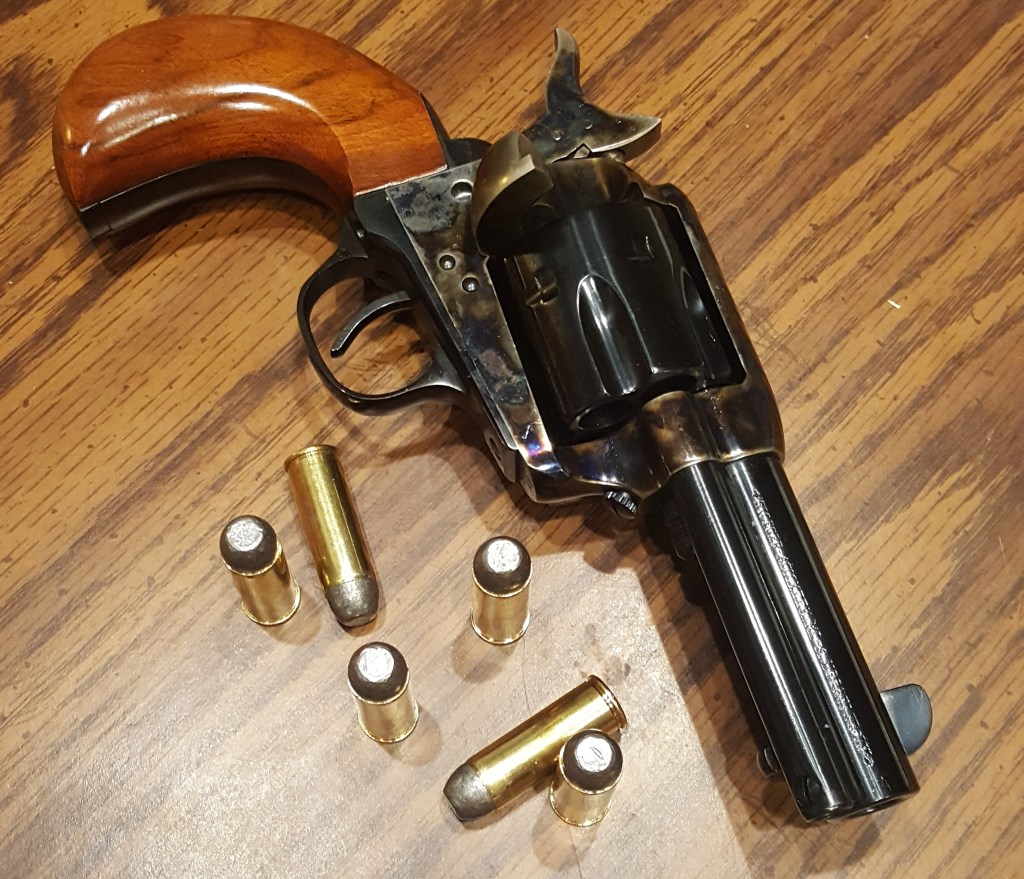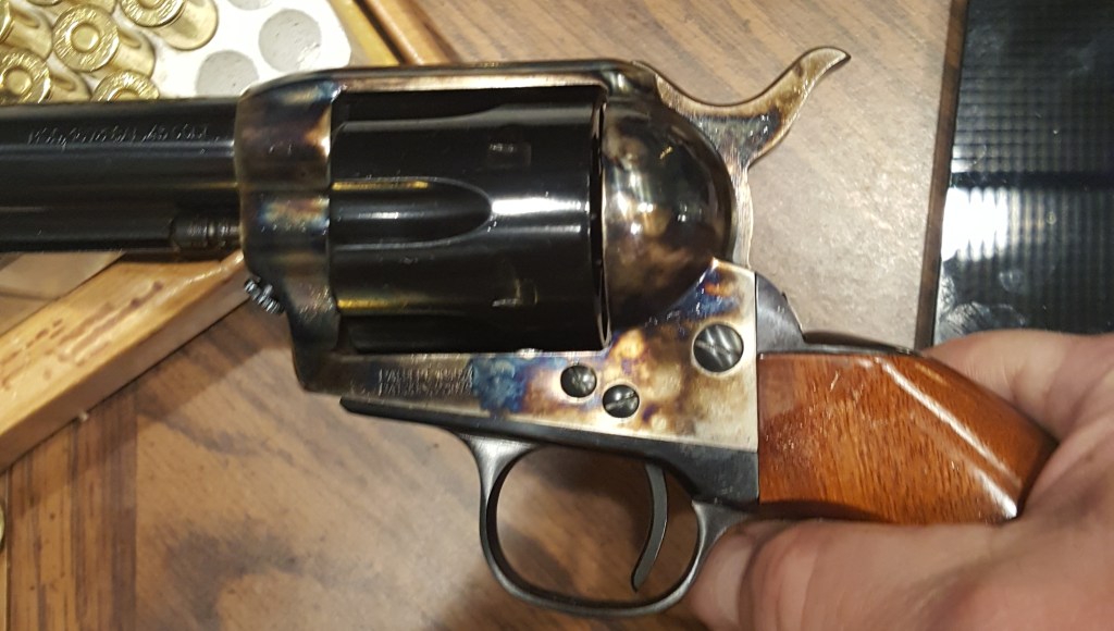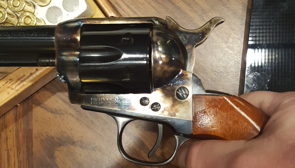 First impressions?? – Oh My My Oh Hell Yes – Baby put on that Party Dress !! – Definitely going to have to start reloading – 45 Colt is not as cheap as 9mm – the shorter barrel feels “right” with the birds head grips – and the grips really help with the recoil – fit and finish are excellent – my blushing bride looked at it and said that’s a nice piece – and she’s right ! There’s something about blued steel and wood – 2 or 3 hundred rounds of Practice ( there you go with that P word again !! ) and this will be a tack driver, alright – a sledge hammer – but it will do it !! Other thoughts ?? Have to figure out a holster(s) to use – You wouldn’t carry that thing would you, Bruce?? Yes – Yes I will – It is incredibly accurate – rate of fire is not quite up there with a semi-auto and reloads are slooow – but that’s why you carry two firearms, it’s called a “New York Reload” – got into that habit in a past lifetime – it’s quicker to pull another than to reload the first – 45 Colt is a devastating round compared to a 9mm – think 2×4 compared to a flyswatter.