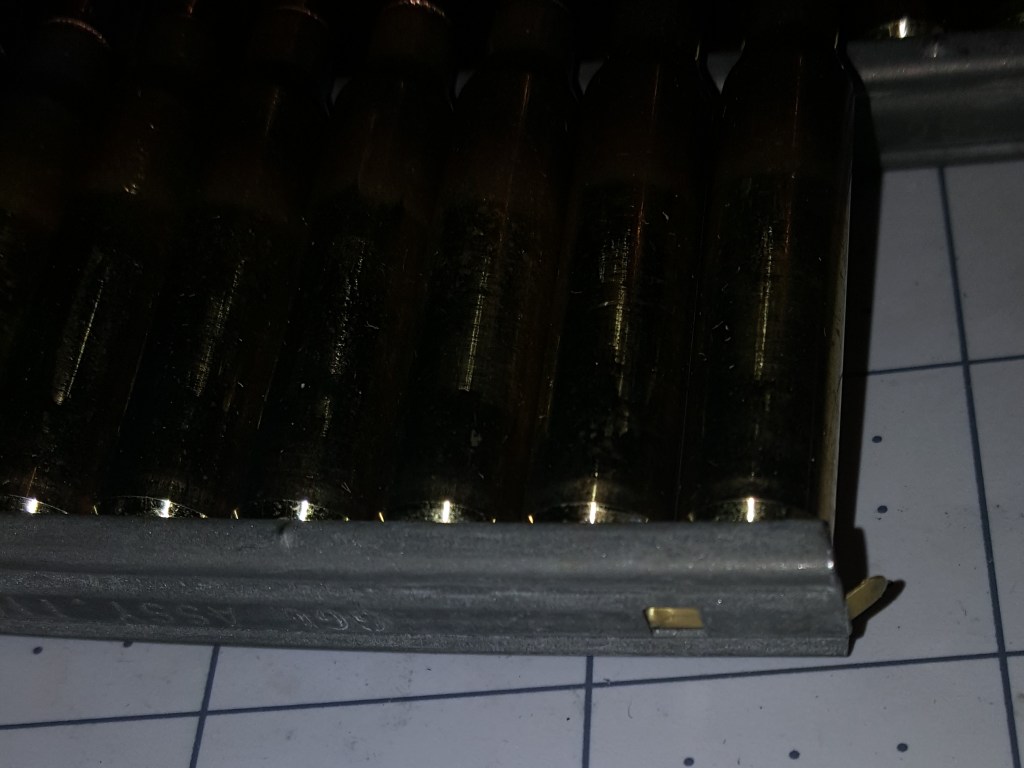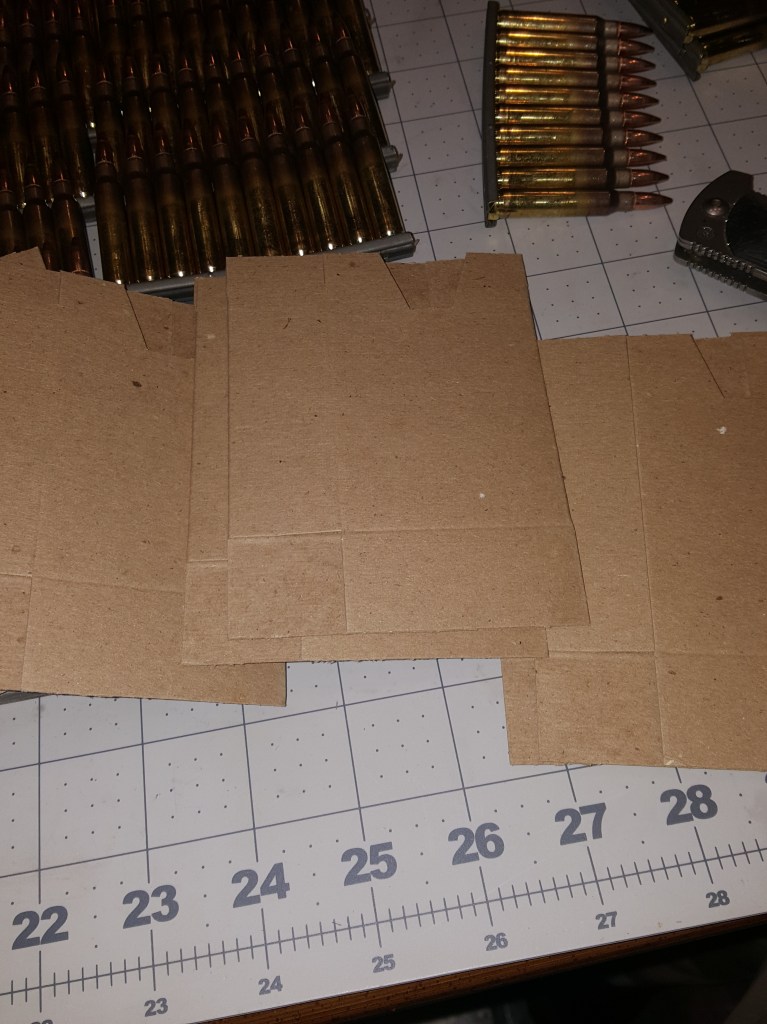 Cardboard sleeves – each one holds three filled stripper clips – 30 rounds – just enough to fill a standard capacity magazine here in America – Can you folks being held behind enemy lines even buy stripper clips??