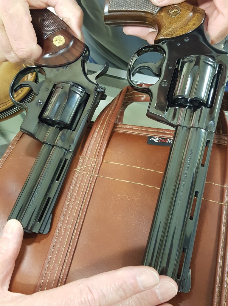 The bluing on the 4 inch is as good as can be – immaculate – old school Colt – the bluing on the 6 inch is unbelievable – make the 4 inch look like a Rossi – you can almost go swimming in it – absolutely outstanding!!
