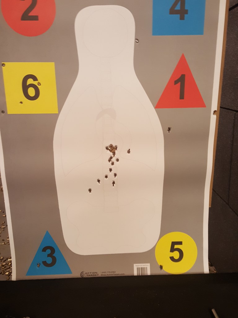 Got some rapid fire time with both snubbys – NO – NOT dual wielding – empty one and drop it the grab the other and empty it – this is 30 rounds @ 7 yards rapid fire . . . Went upper left – upper right – lower right -lower left then center . . .