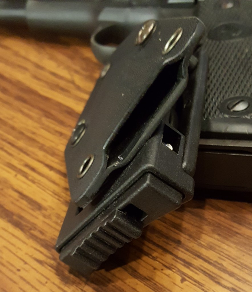 The belt clip is solid – you can adjust for the width of your belt by simply popping the spacer out and using different slots . . .