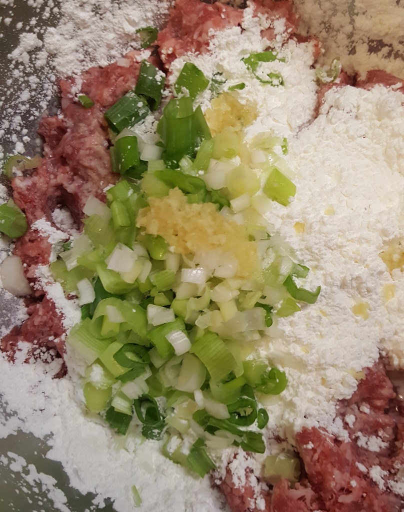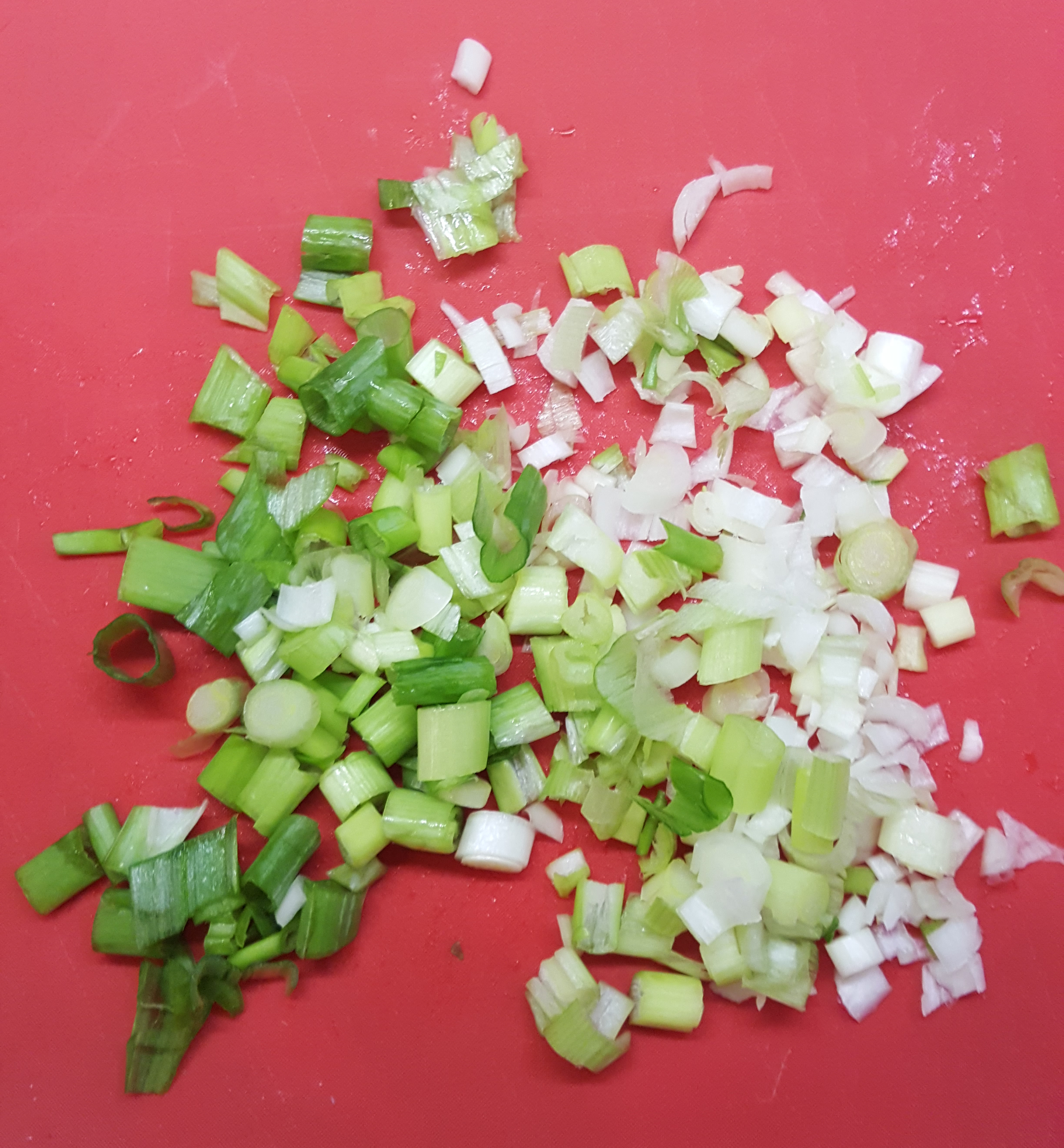 You don’t have to mince them – but the green onions need to be chopped up fairly fine – toss them in . . .