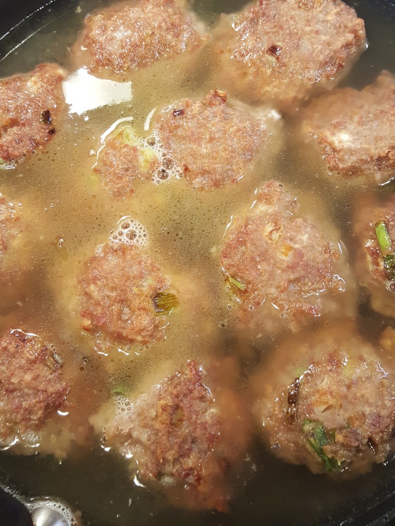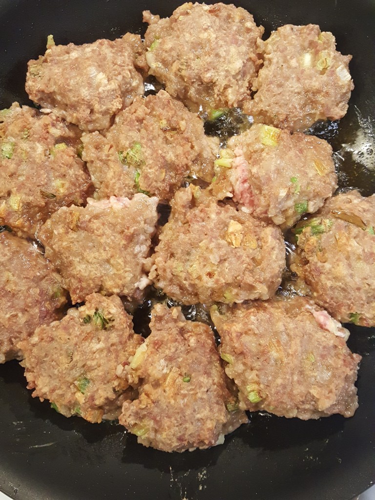 Heat the oil in the skillet – medium heat or so – and in go the meatballs . . .