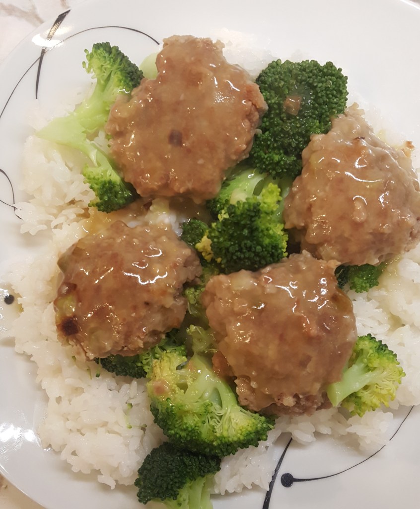 bed of rice – some broccoli – 3 or 4 meatballs – some sauce – Enjoy!!