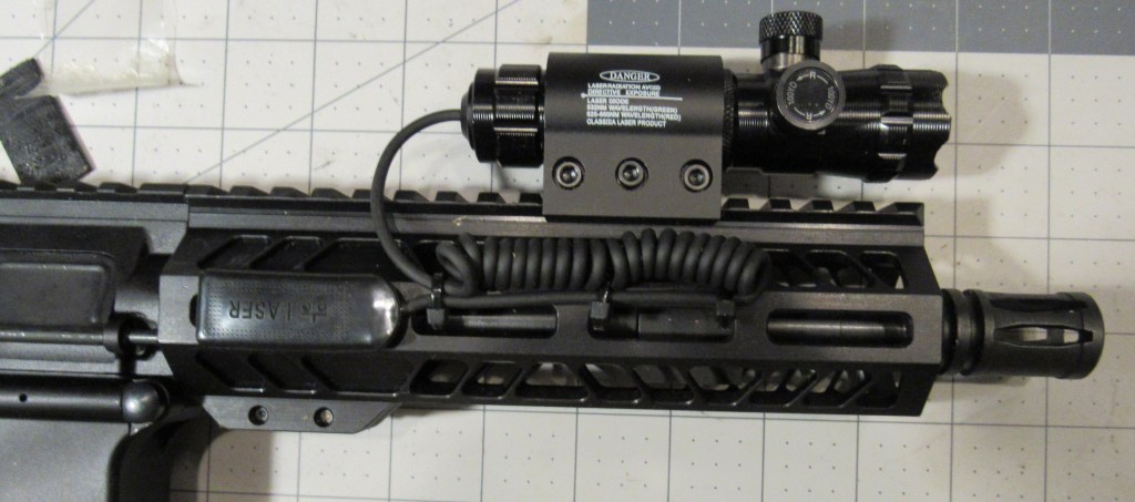 The bore sight laser and the Pinty laser are sighted on top of each other at 67 feet – the bore center line is about 1 1/4 inches low at 21 feet . . .