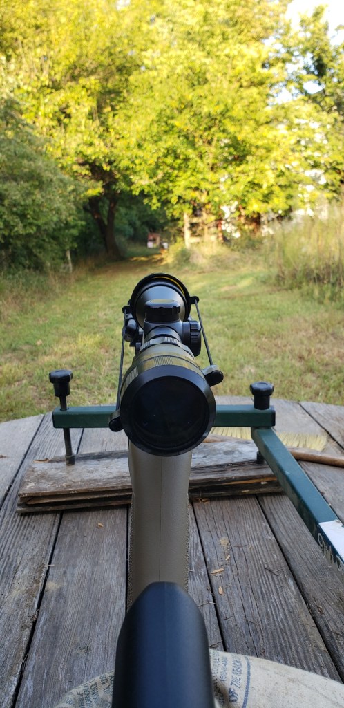 It’s right at 50 yards from the muzzle to the wood frame – trust me, it doesn’t look any closer in person – if time and scheduling “work” I will try to get y’all a close look at the rifle – it’s pretty cool – and if the stars line up will try to get some 10 and 15 yard stuff with pistols done . . .