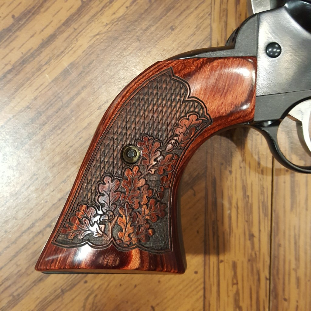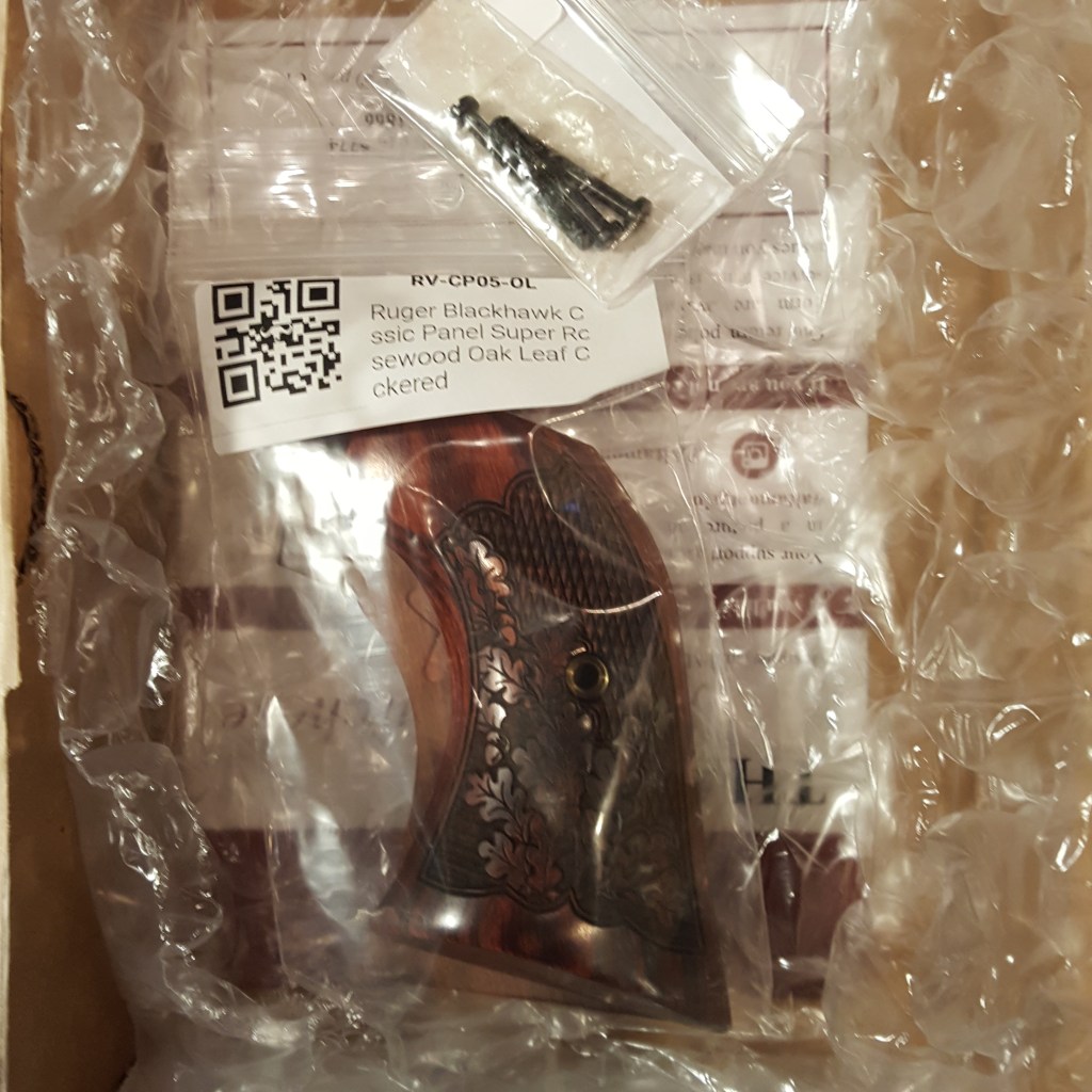 Altamont Grips ?? – Wonderful product – great fit and tolerances – good color / Super Rosewood Oak Leaf pattern is just pretty / GREAT mix of pattern vs checkerong – just the right amount of “shine” to the finish – checkering feels good, won’t know for sure until I get a chance to shoot it – a GREAT value at 54.10 – just about THE definition of “money well spent” . . .