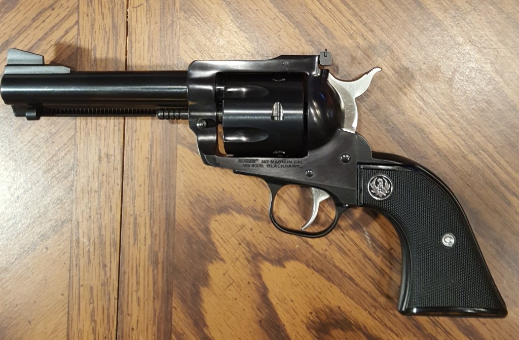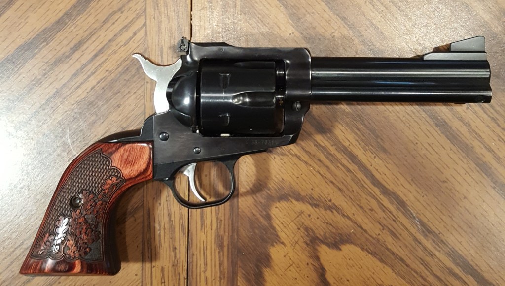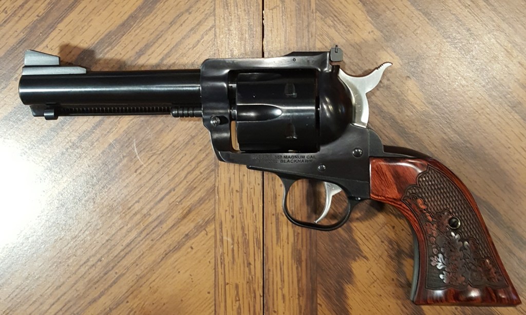 Takes a Plain Jane Ruger and just about makes a BBQ gun out of it – with the right holster and belt ?? – maybe something like this from Andrews Leather . . .