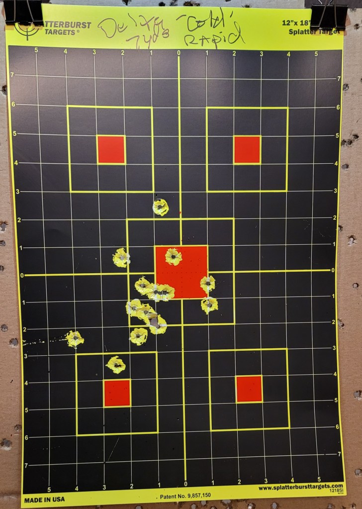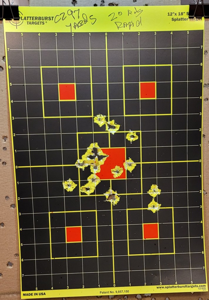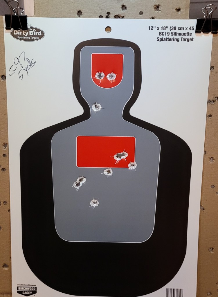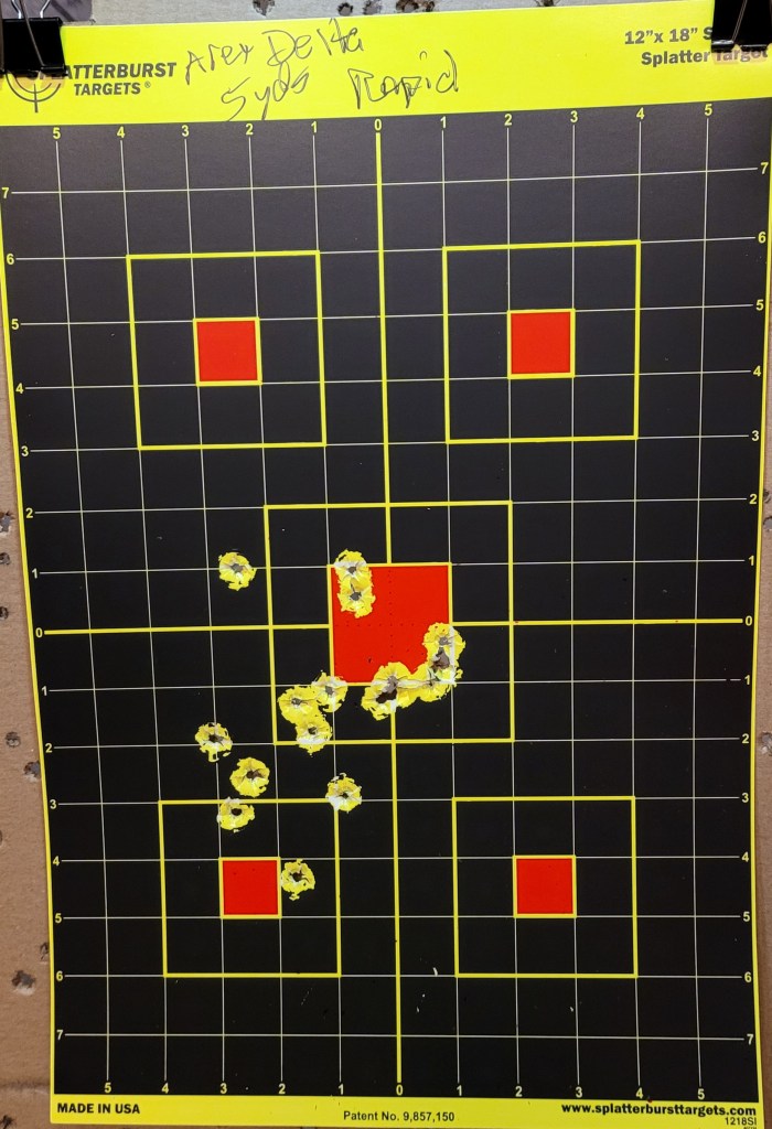 Mozambique drills – three as fast as I could run – 2 chest/one head – gun down to low ready then three more and on – the 10th round went into the wide hole in the red chest box