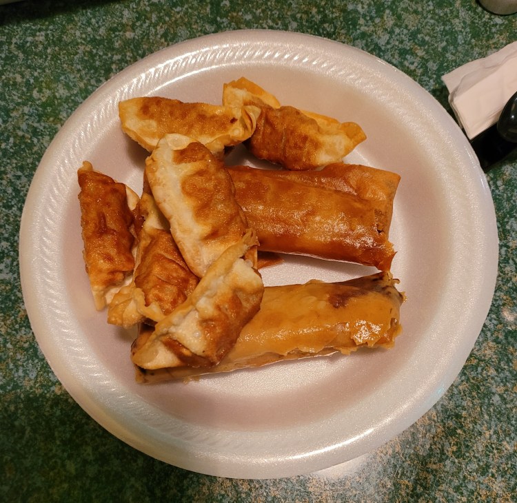 Shrimp egg rolls and an order of fried pork dumplings for appetizers – Mmmmm . . .