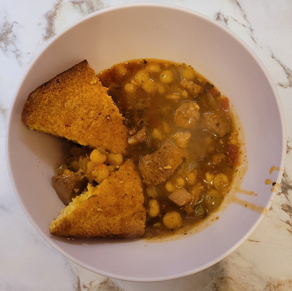 I started thinking about the post Thursday – started sticking it together very early this ( Friday ) morning – and I just went ahead and threw a batch together – and put this up to give you an idea what it comes out like – this particular batch had 1 can red enchilada sauce and 1 can green enchilada sauce and I used yellow hominy.