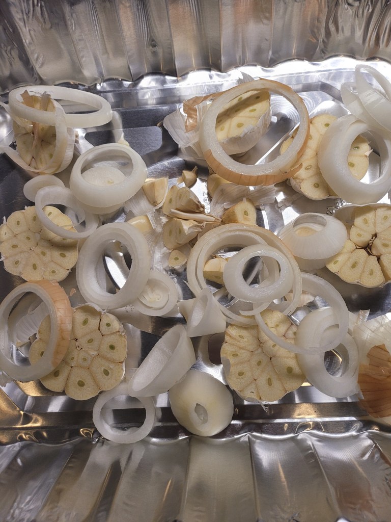 Big aluminum pan – 4 onions – 4 whole garlic – Slice the garlic in half – the onion 4 or 5 slices – a decent set of kitchen knives are a plus – Henckels is a real decent entry level knife that won’t break the bank and you will get a lot of good service out of them – check them out HERE