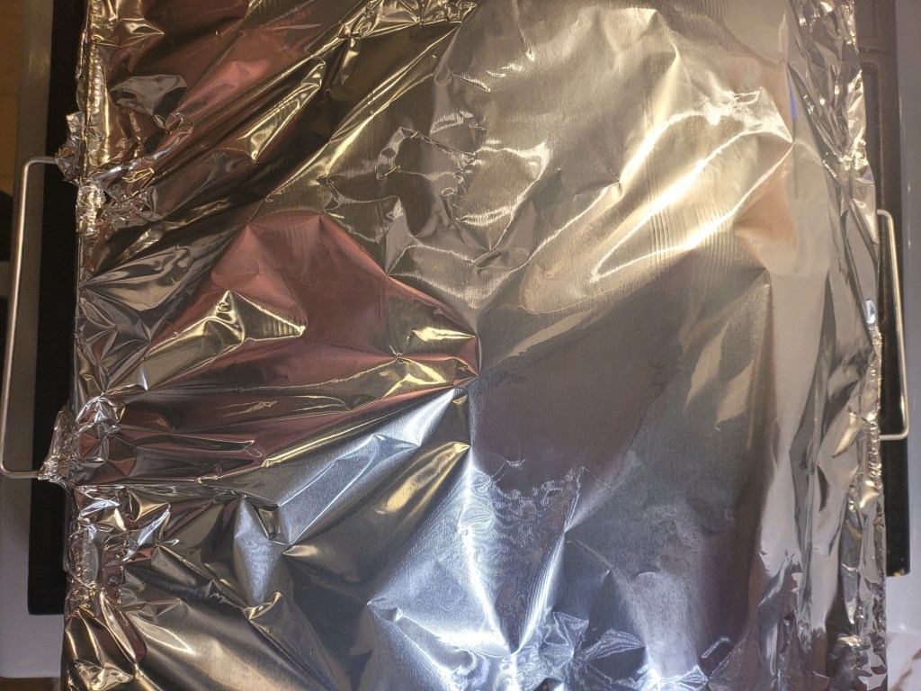 Seal up tight with aluminum foil – put the foil pan on a cookie sheet – the aluminum pans are not very sturdy ( Don’t Ask! ) . . .