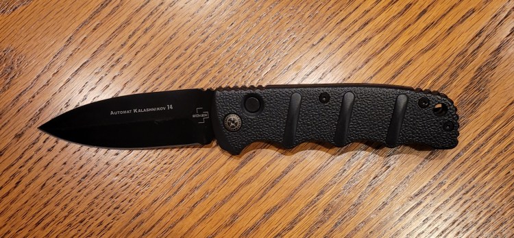 I have been wanting a knock around auto knife for a long time but I just couldn’t wrap my head around carrying a 200 to 400 dollar ( or more ) knife as a grunge knife – cutting everything from insulation off of wire to a chunk of sausage – something a little easier to utilize than my Gerber Freeman – so I ordered a Kalashnikov by Boker from BladeHq . . .