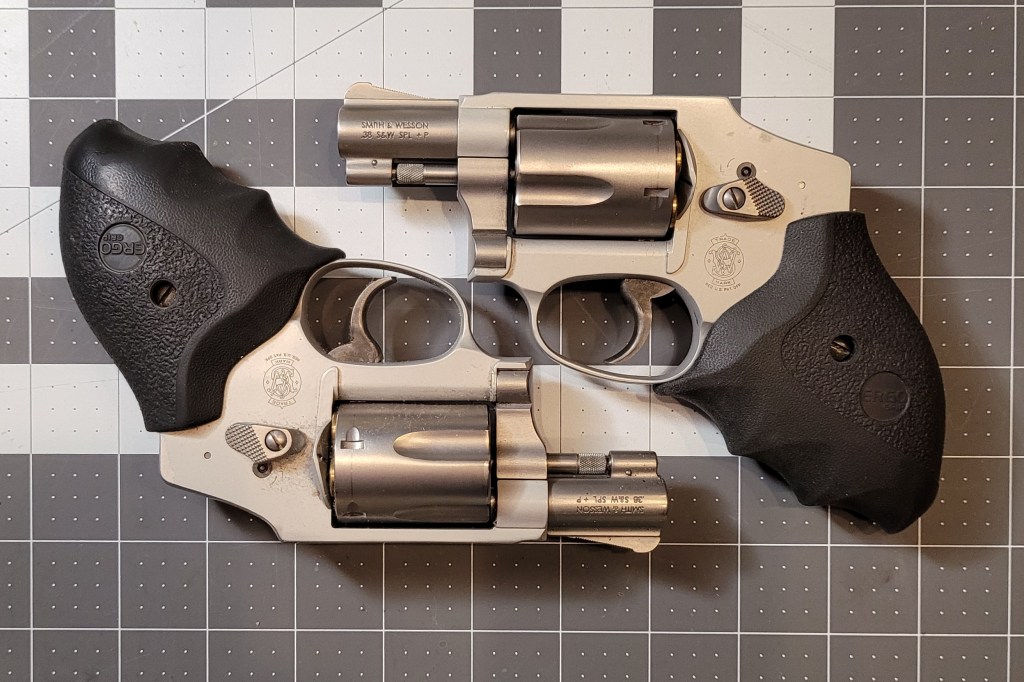 2 642’s with Ergo Delta Grips and Wilson Combat spring kits – The top one came out of the belly band and the bottom one came out of the pocket holster for this cameo appearance . . .