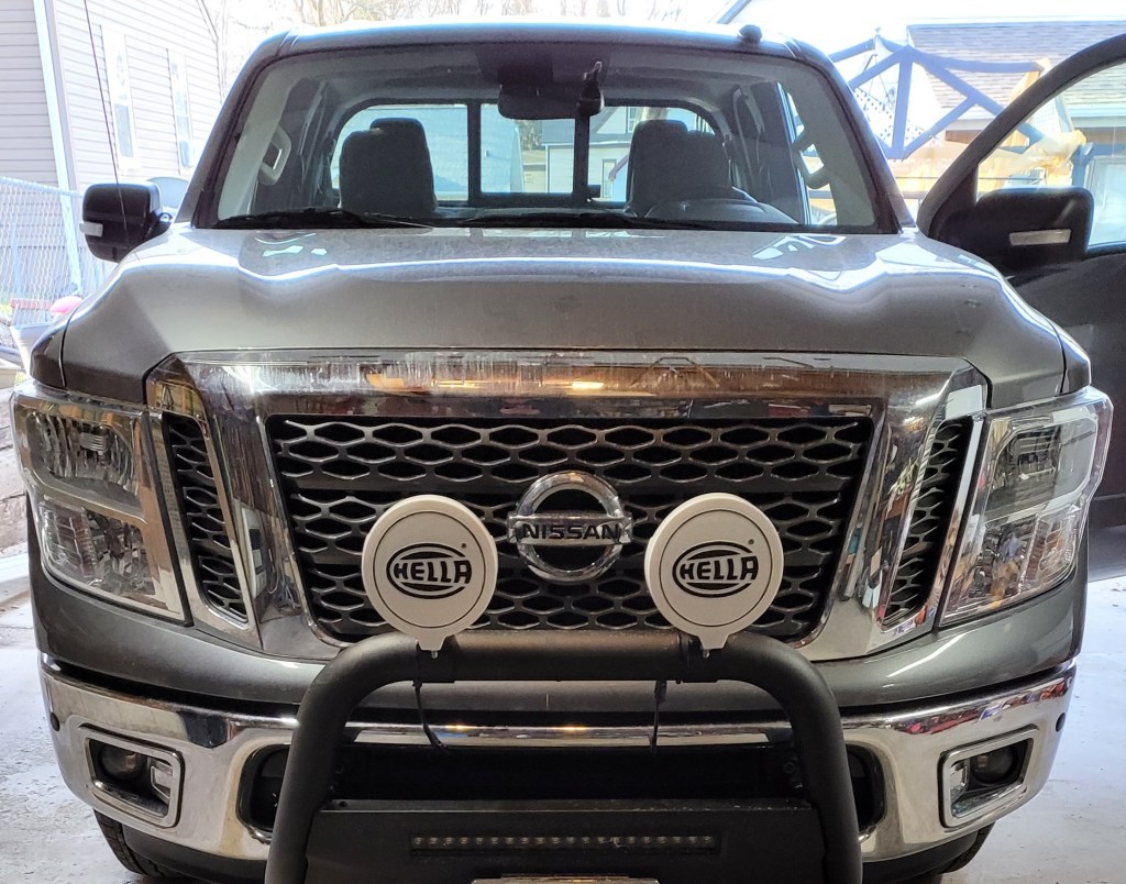 Took the tow hooks off my new “old beater” to put a bull bar on to use for auxiliary lighting mount points – it came with an LED light strip – got a pair of Hella 700FF driving lights mounted and a pair of Hella 550 amber fog lights coming that will mount just above the Led strip . . .