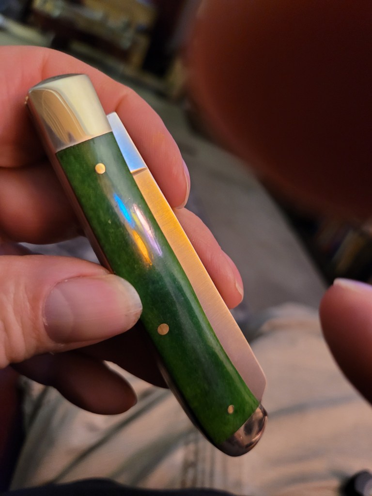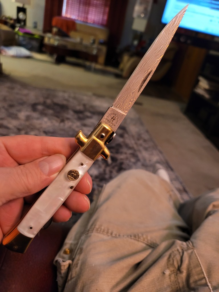 And picked up a pearl stiletto – really good looking – they lay the pearl veneer on the frame then use clear acrylic scales over it – gives it a great “depth” effect . . .