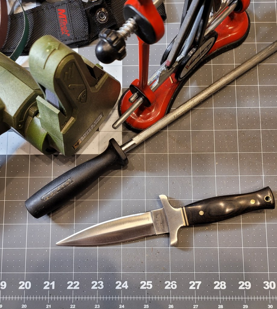 Picked up this MTech dagger pattern knife on Amazon for 20 Bucks – Pakka Wood Scales and the pattern caught my eye. I realized when I bought it it was more “decorative” than functional – bur damn – I have butter knives that are sharper! After an hour or so with it – it is beginning to be sharp – a few more hours of working with it – it will be sharp – it won’t retain an edge very well – it’s straight stainless – but a dagger is not generally used in a “protracted” fashion – It will be sharp enough to stick with – and look good – and of course I make it look better – LOL!
