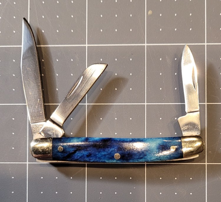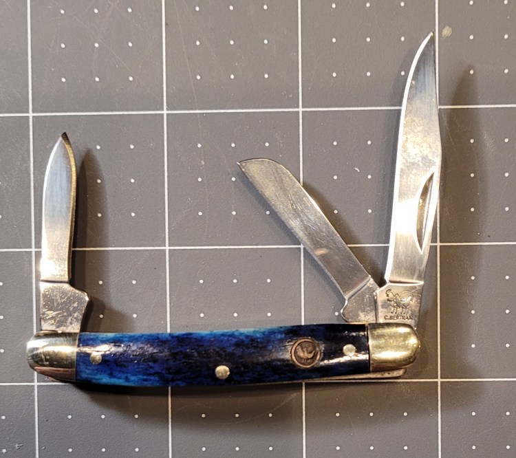 You’re looking at a “Hen & Rooster Blue Smooth Bone Mini Stockman” – that’s a whole bunch of name for such a little knife – but it’s worth every word – everyone who has handled it all say pretty much the same thing – How do they get so much goody in something that small??