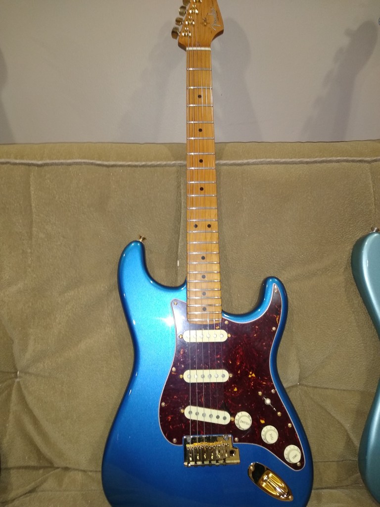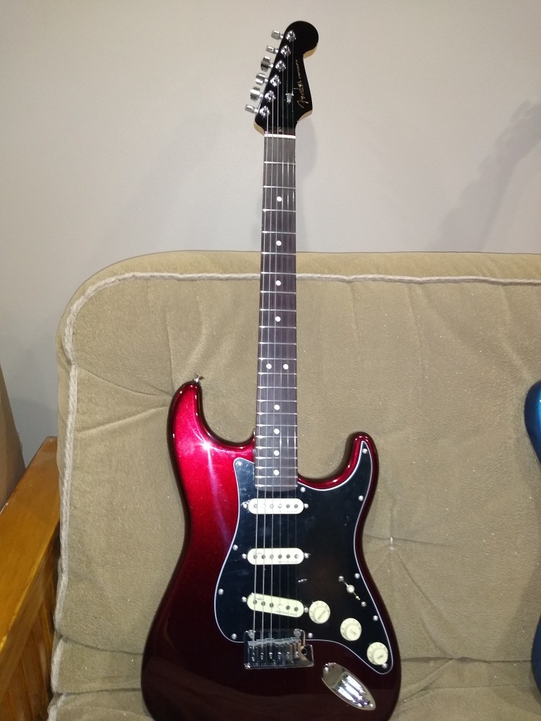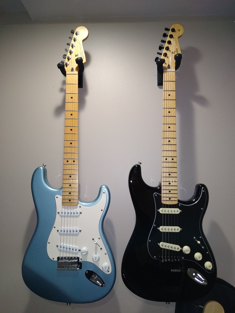The Fender strat on the left is a 2001 Standard. Probably one of my favorite to play. The Fender on the right is a 2018 Standard. I put a Bacitz bridge on and decked it to the body. I added fender locking turners. And will soon change out the pick ups for something, not sure yet. This a great feeling strat. I like the way the neck feels. It is a great C shape.