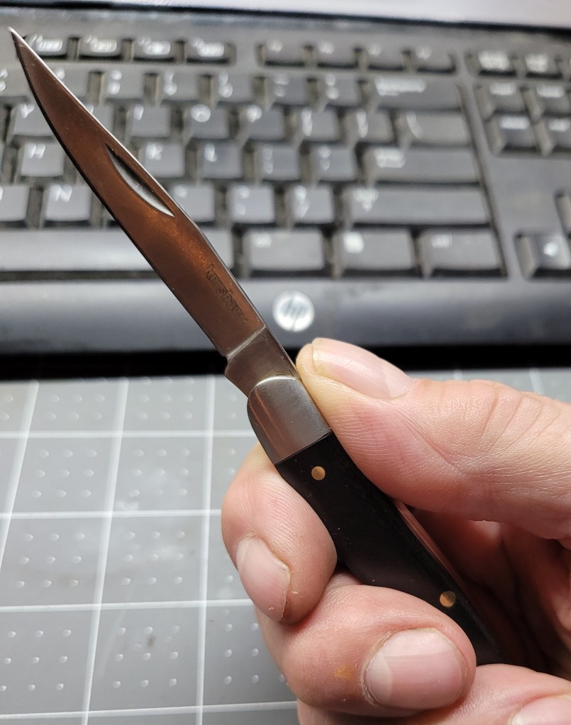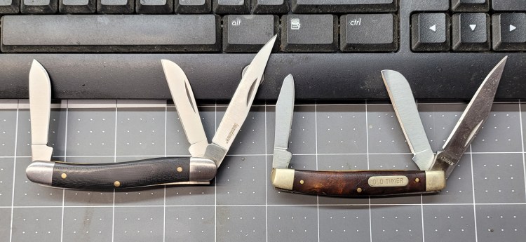 Here we are with the Old Timer orphan I gave a home to – the differences are subtle but they add up – the Old Timer is a 34otw – 34 is the pattern – the letters O and T denote Old Timer and the W denotes wood – the current 34otw gets you to an ironwood version – Schrade is not using burl wood at this time . . .