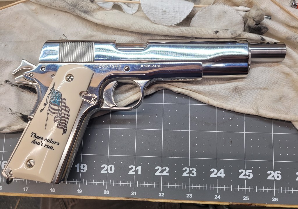 A Cimarron Nickel 1911 – Sweet Stuff – and in God’s chosen caliber as brought to us by Saint Browning – .45 ACP (LOL) . . .