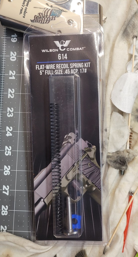 Of course I changed the recoil spring and guide rod to a Wilson Combat from Brownell’s – and threw the buffer away – this makes a noticeable difference in the recoil impulse . . .
