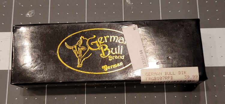 What we have here is a German Bull Dirt Buster – the pic of the box shows the stock number FRGBxxxxxx – Which is Frost / German Bull / German made – Smoky Mountain had this on sale for Labor Day for $29.00 ( $10.00 off the list price ) – so I added it to the order – no disappointment here on arrival . . . ( the knife is still on sale as I am posting this )