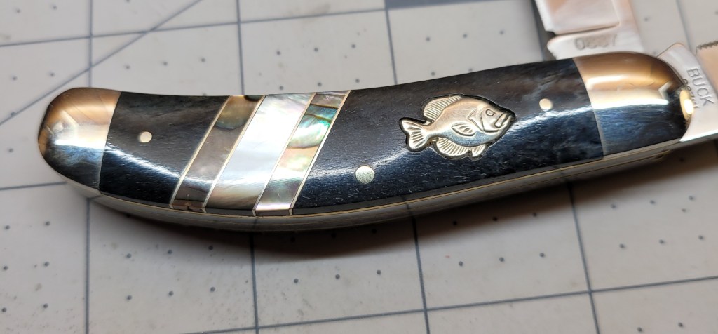 Nickel silver bolsters – Nickel silver pins – gold toned crappie – smooth black bone – mother of pearl and abalone accents – oh so nice . . .