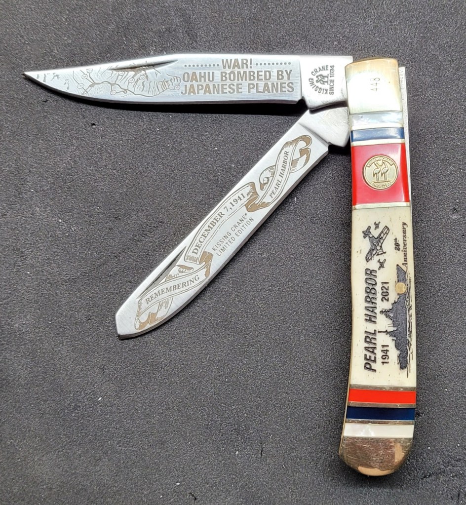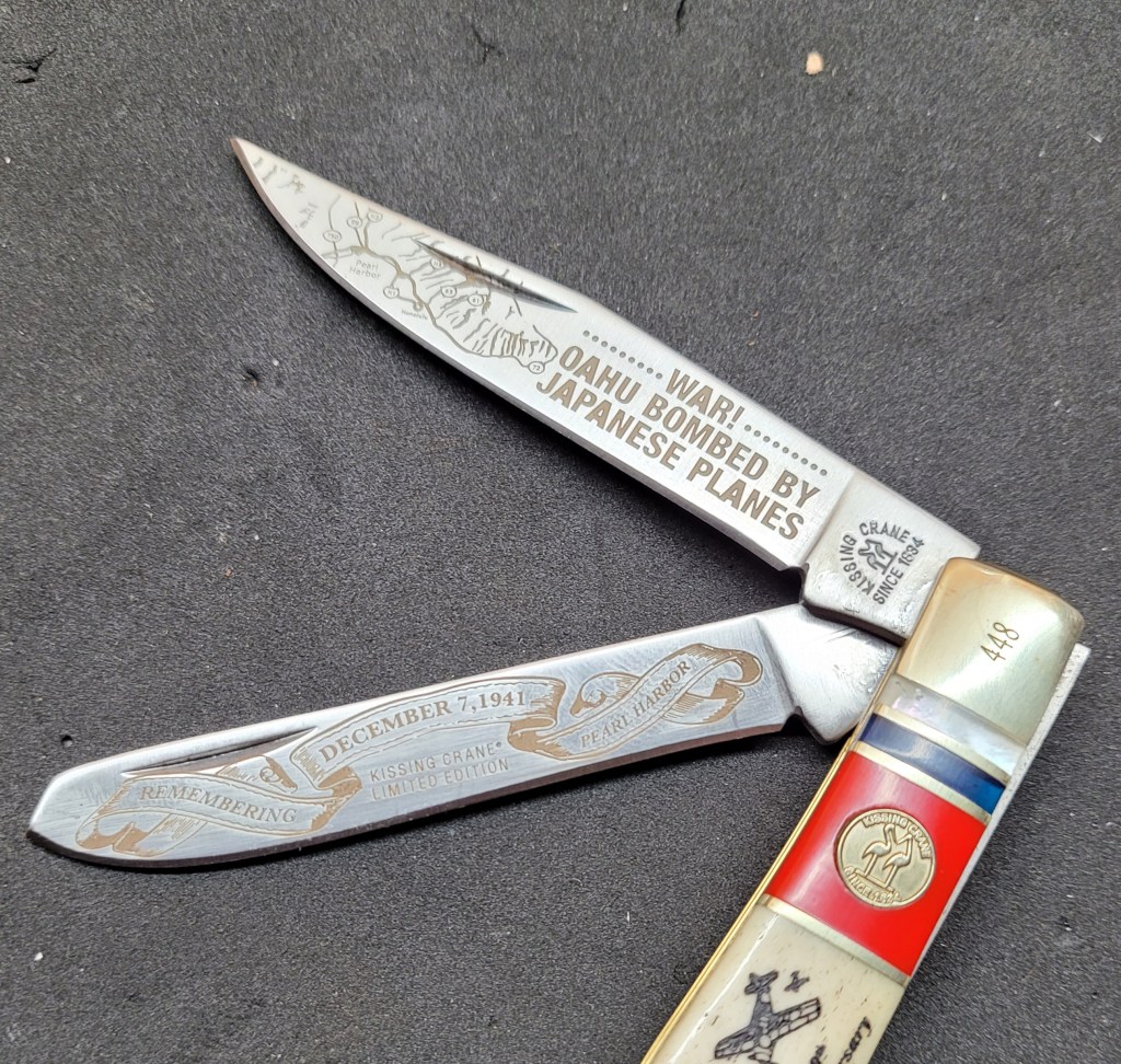 Kissing Crane knives are good stuff – and their “commemorative” line?? At $30 to $35 bucks apiece – the attention to detail and the way they carry out the “art work” ( for lack of a better description ) – the way the whole knife / scales / blade engraving comes together on any of them they are well worth the price of admission – any of them are a real nice addition to any collection . . .