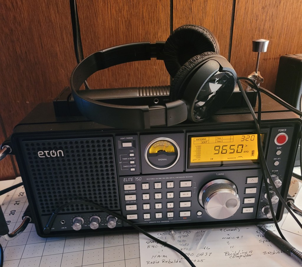 Right at this moment the MLA-30 is stuck out the window on a 10 foot pole and it’s more or less “blind” to the west ( metal siding ) so it’s not a fair comparison to the long wire antenna – the Eton makes it easy to switch between the two antennas as the loop is connected to a BNC connector for external antennas and with a click of a switch it is receiving through the internal whip antenna – just clipped the long wire to the whip – simple and easy . . .