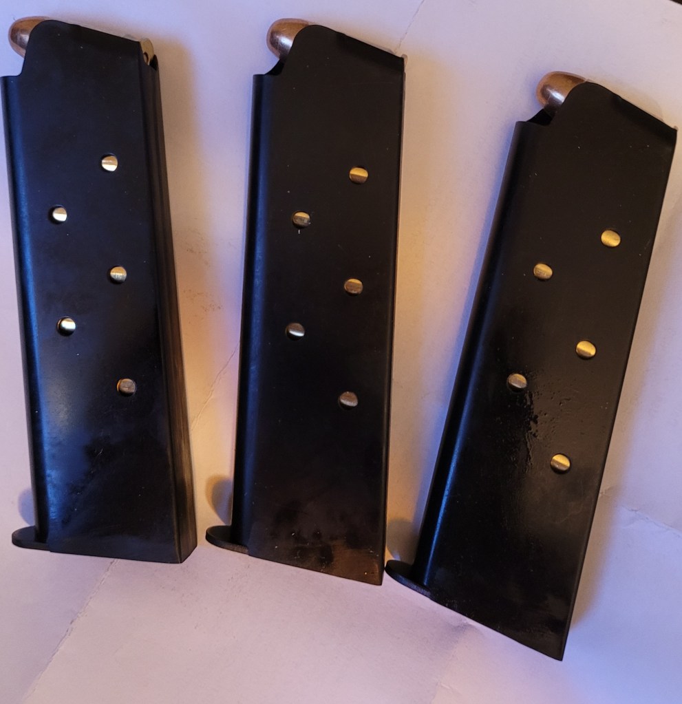 The main reason for the 7 rounders? The 8 round mags in the Colt M1991 and the Cimarron 1911 just don’t look “right” – the Colt more so than the Cimarron. So I loaded the mags up and will leave them be until Saturday/Sunday – then unearth the vault – dig both 1911’s out – and take them to the range – and burn through some .45 hardball to make a thorough function check and get some pictures with the 8 rounders as opposed to these in both guns.