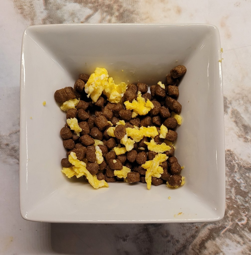 kibble and scrambled legs good – it’s what in my bowl – what did you have for breakfast? can i have some? i would be willing to taste test it for you – make sure it is OK to eat!