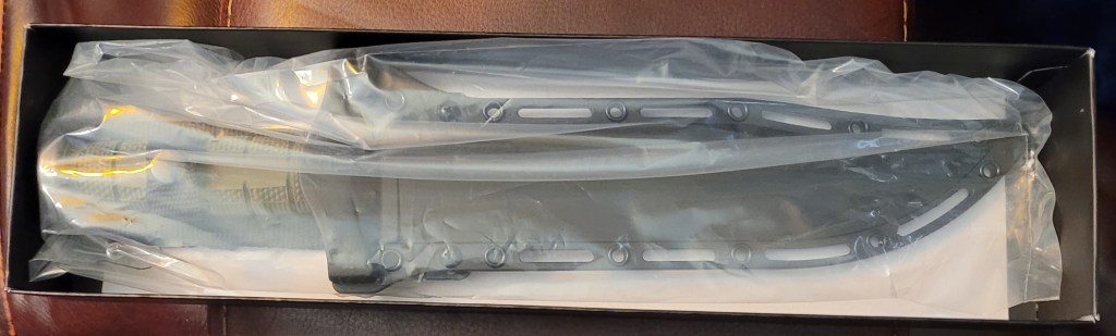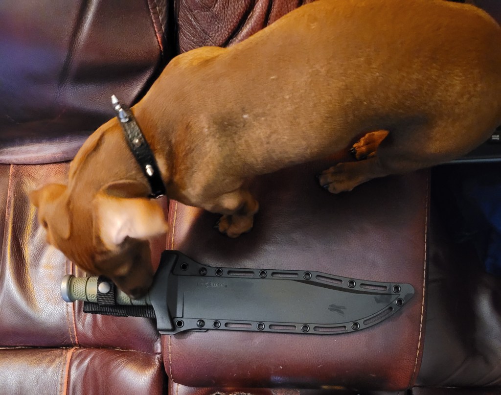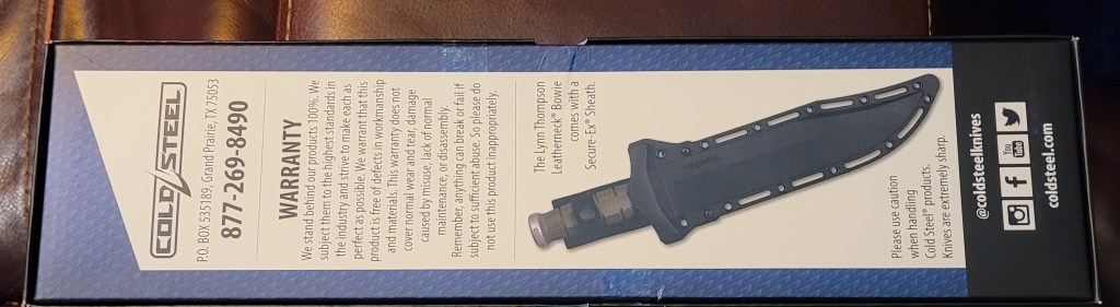 Folk – the stats just don’t do it justice – this is an absolute beastie of a knife – good texturing on the handle – not as front heavy as I expected – has a real let’s go chop shit up feel to it – to say it’s over the top? – for most companies yes – for Cold Steel? It’s just about right . . .