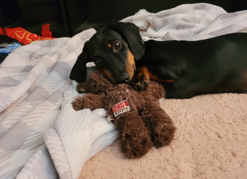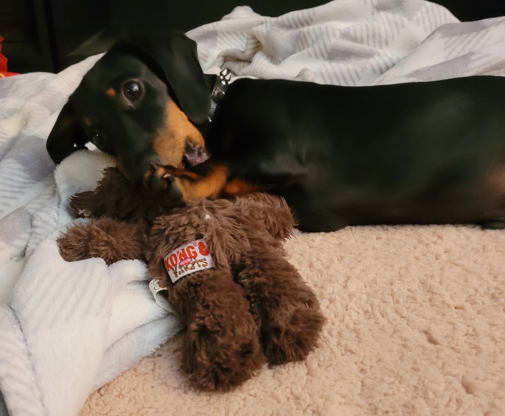 The girls at the groom shop at Petco gave Curtis and Oliver little bear toys – Curtis is lukewarm towards anything BUT a squeaky ball – Oliver loves his bear!