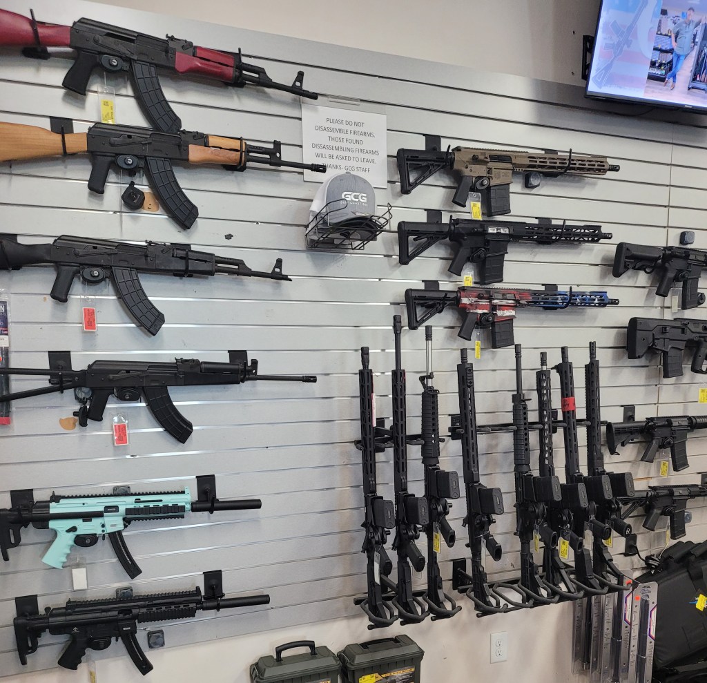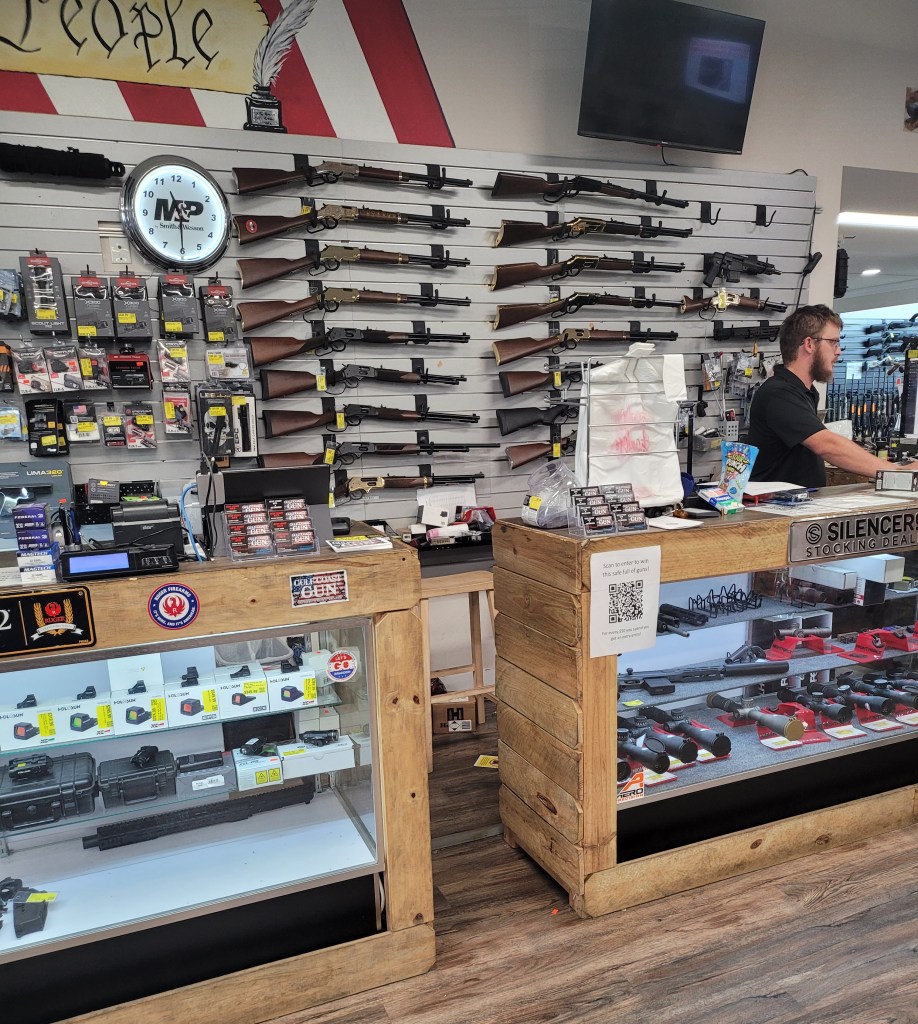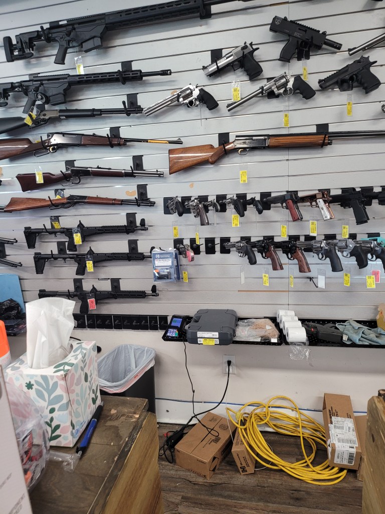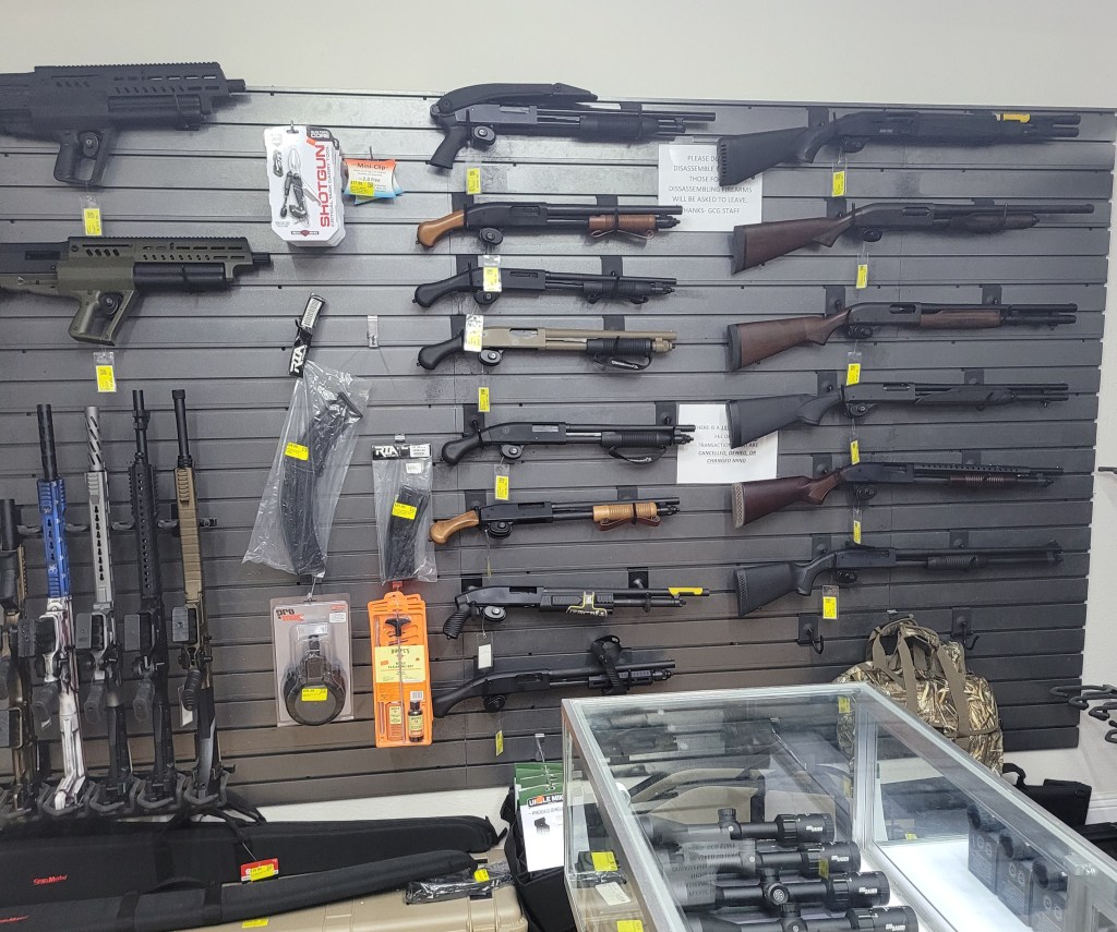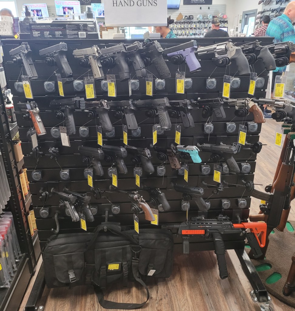 No space wasted – used handguns hanging out on the end of a gondola . . .