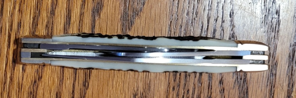 With a 3.25 ” clip point blade and 2.12″ spey and sheepsfoot blades – the little knife has enough blade to handle most any “pocket knife” tasks at hand . . .