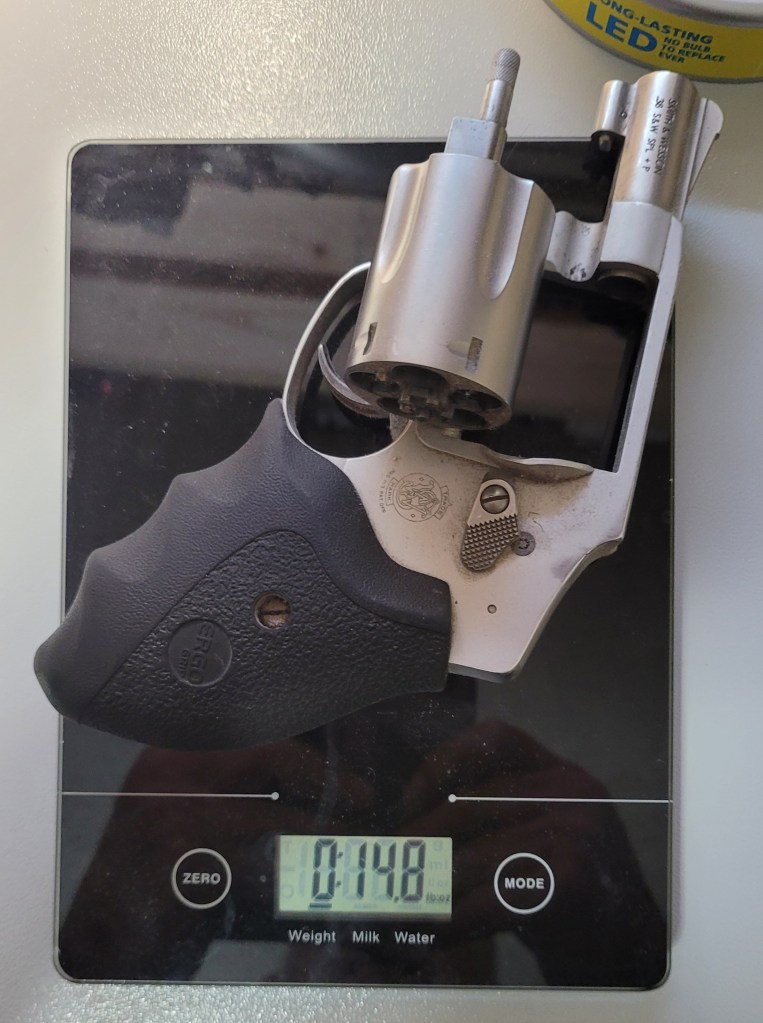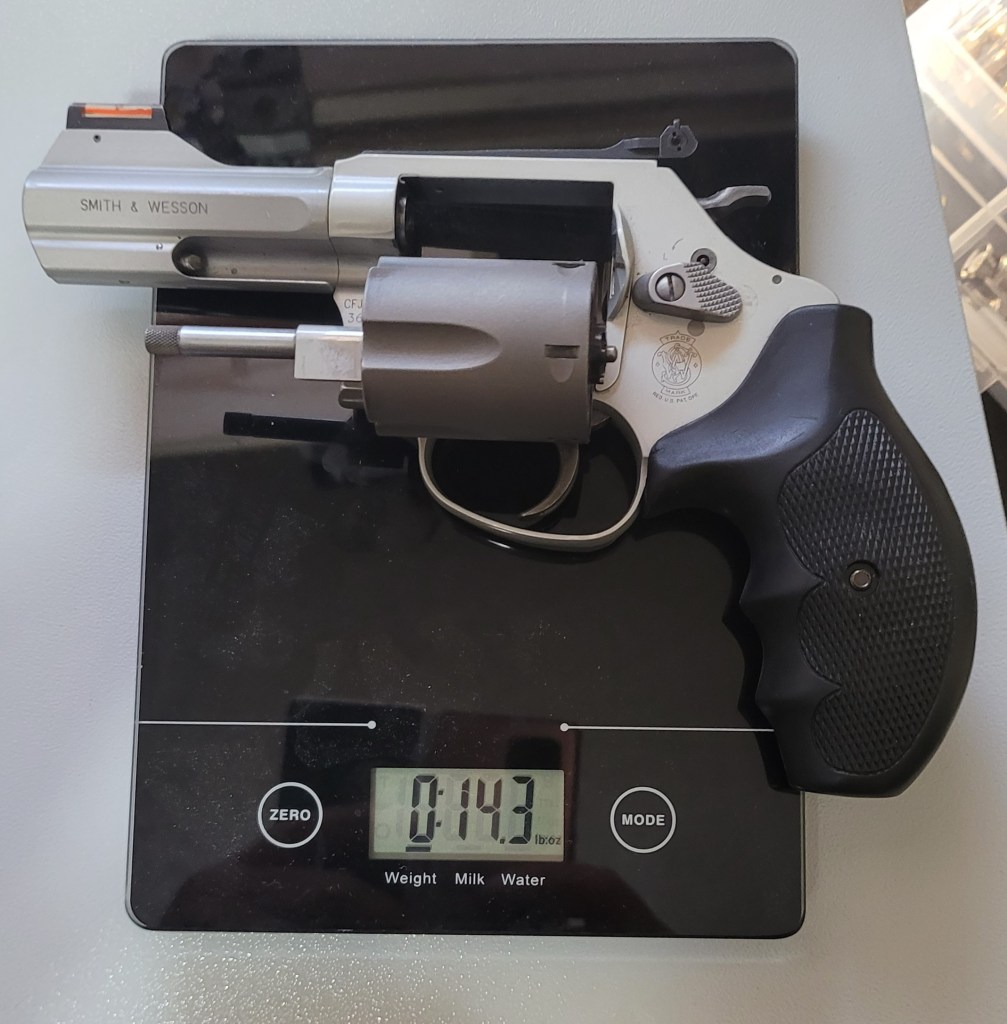 Compared to the S&W 642 it’s a 1/2oz lighter – the 642 shooting 158grain semi wad cutter gas checked plus p hollow points which are rated at 1150 fps – plus or minus – is bearable for about 25 to 30 rounds of range practice – but that’s about all you want to do in one session – just saying . . .
