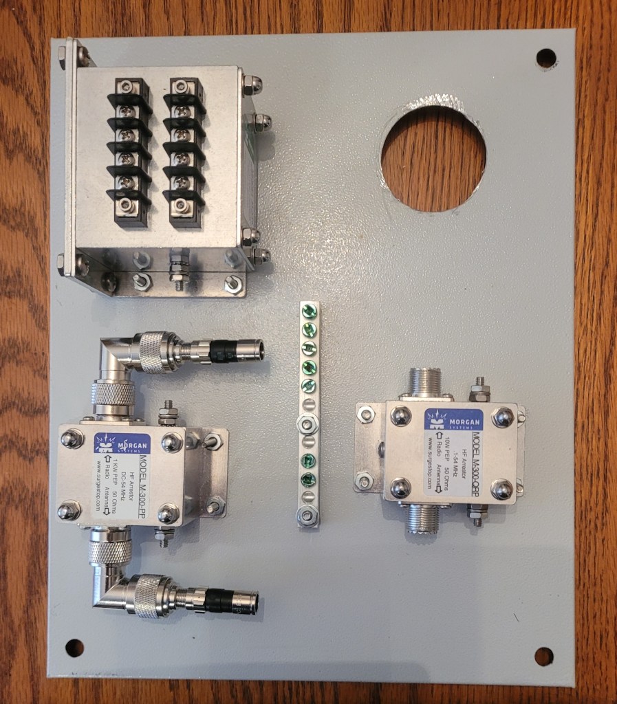 The mounting plate for the entry box – top lightning/surge protector is for the rotator control cable – left side bottom is a power pass lightning/surge protector for the loop antenna – bottom right is a lightning/surge protector for the long wire . . .
