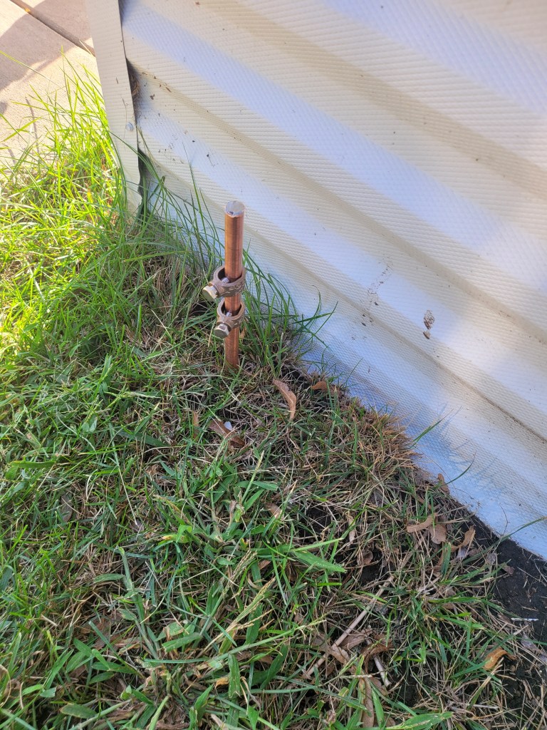 Also running off the ground strip in the entry box will be a piece of #6 solid copper going inside to provide grounding for radios with grounding points – and very few new radios have a grounding point available – but most of my old beasties do . . .