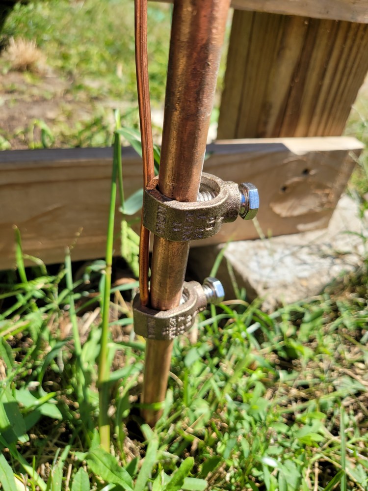 That #6 solid grounds the Unun and coax sheilding – and rotator / mast assembly – the second clamp takes a #6 solid around to the entry box . . .