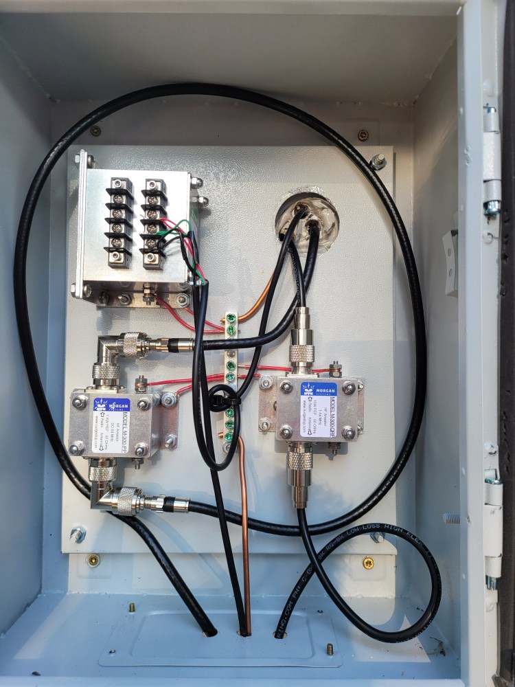 Provides grounding for the surge protectors – and – a ground for the entrance end of the coax as well as surge protection for the rotator control cable and a #6 solid into the radio room for grounding of radios and equipment as well as one more grounding point for shielding on coax . . .
