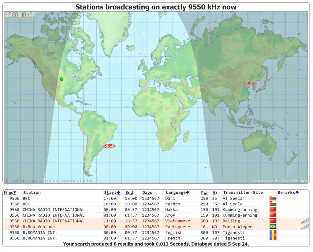 So at the same time China Radio International is pumping out 500,000 watts to the west in my direction – the green dot is my approximate location . . .