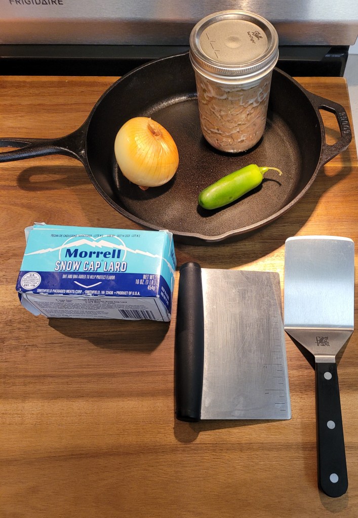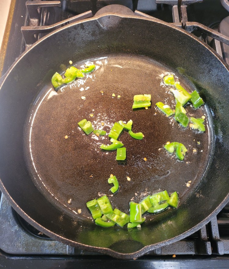 Get your skillet hot ( depending on burner size ) 3 – minutes – add a tablespoon or so of lard – when it melts down – in with the diced jalapeno – give it a couple of minutes – then . . .